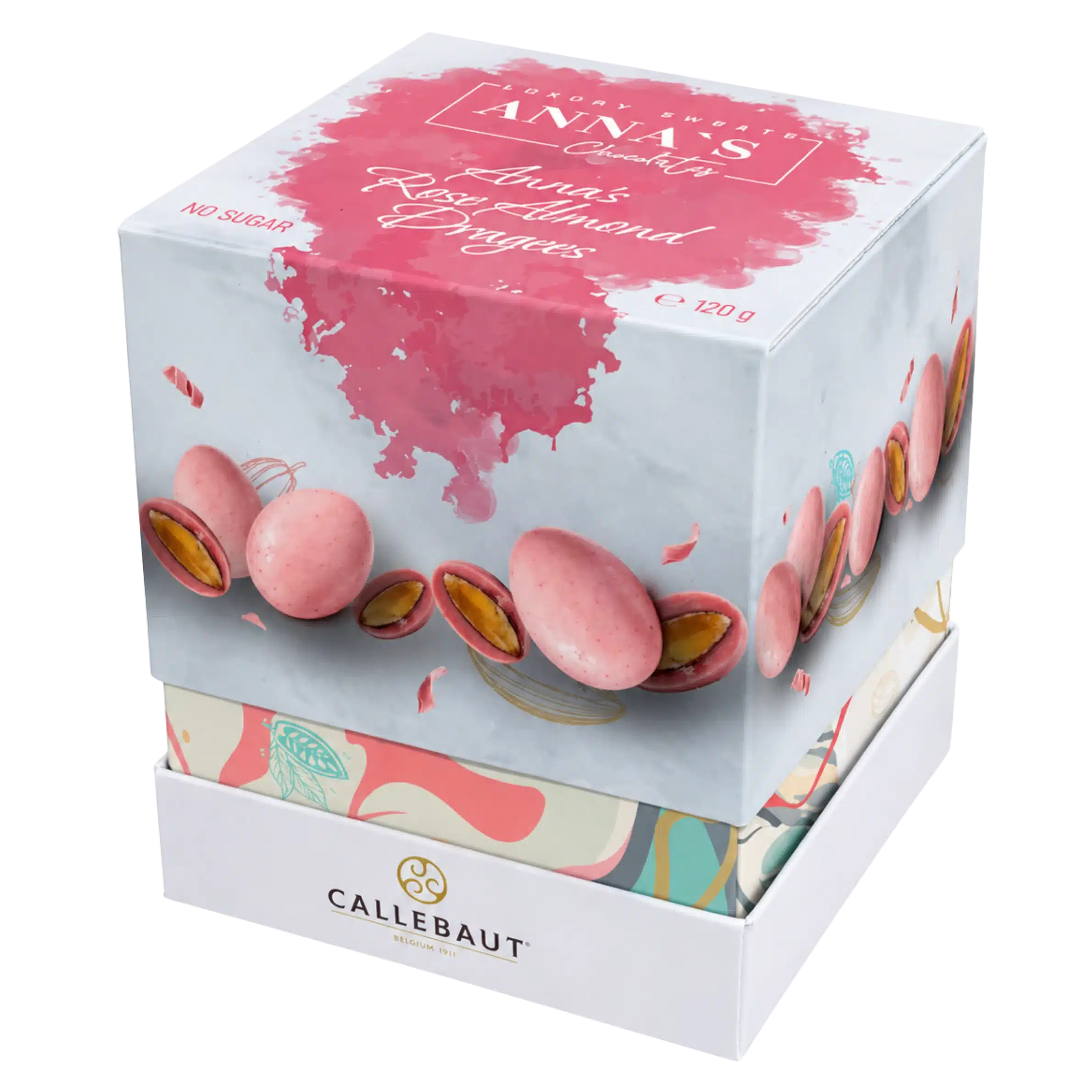 бял шоколад “CALLEBAUT ” 32.2% (подсладител: малтитол, какаово масло, пълномаслено МЛЯКО на прах, емулгатор- СОЕВ лецитин, естествен ароматизант- ванилия), печени БАДЕМИ, какаово масло,лиофилизирани малини, растително масло от роза Дамасцена 0,01%, оцветител: Е124