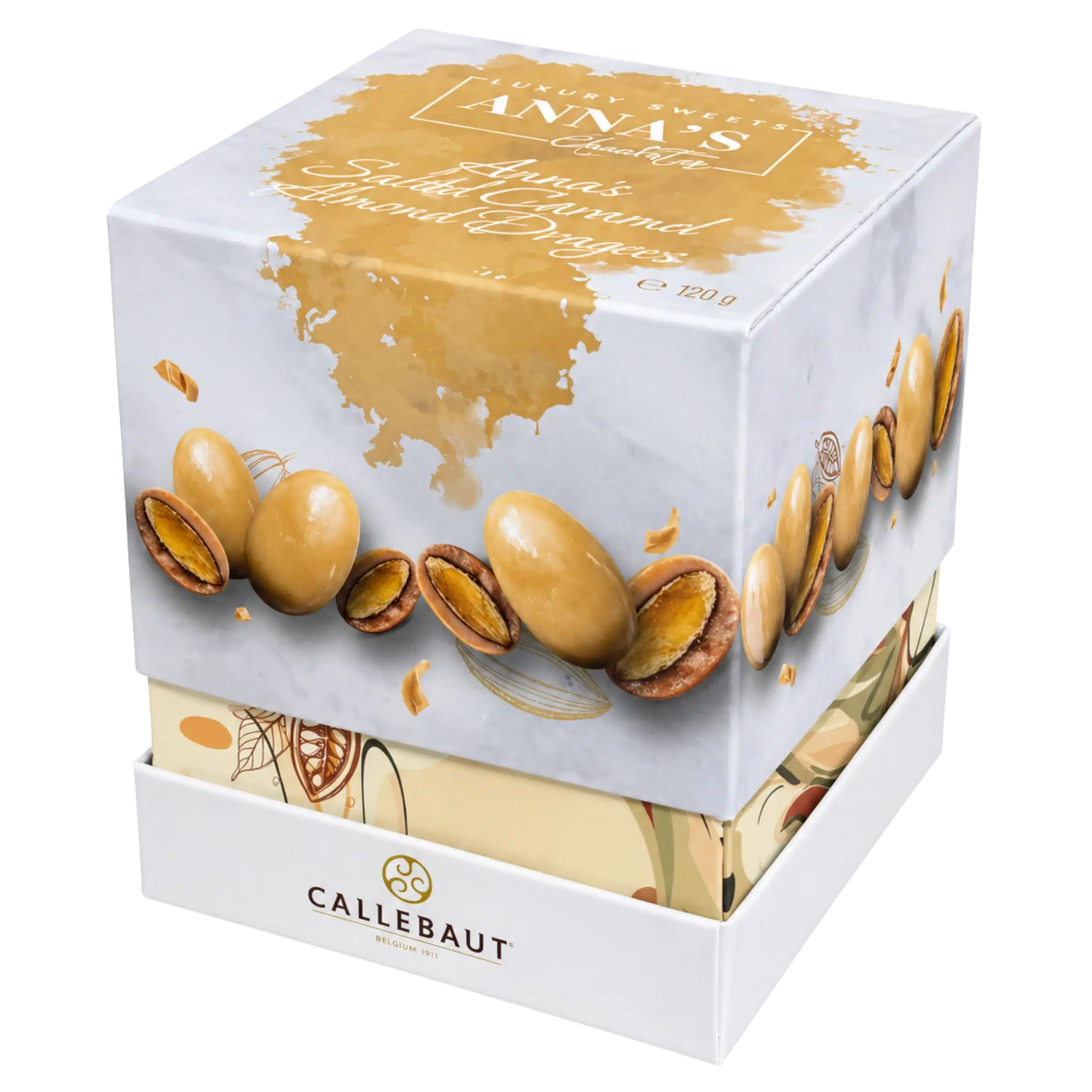 бял шоколад “CALLEBAUT Gold” 31.9% (какаово масло; захар; пълномаслено МЛЯКО на прах, МЛЕЧНА захар, суроватка на прах (МЛЯКО), обезмаслено МЛЯКО на прах, карамелизирана захар 2%, емулгатор: СОЕВ лецитин, естествен ароматизант- ванилия, сол), печени БАДЕМИ, дехидратирана глюкоза, какаово масло, пушена морска сол “Maldon” на люспи- 0,2%.