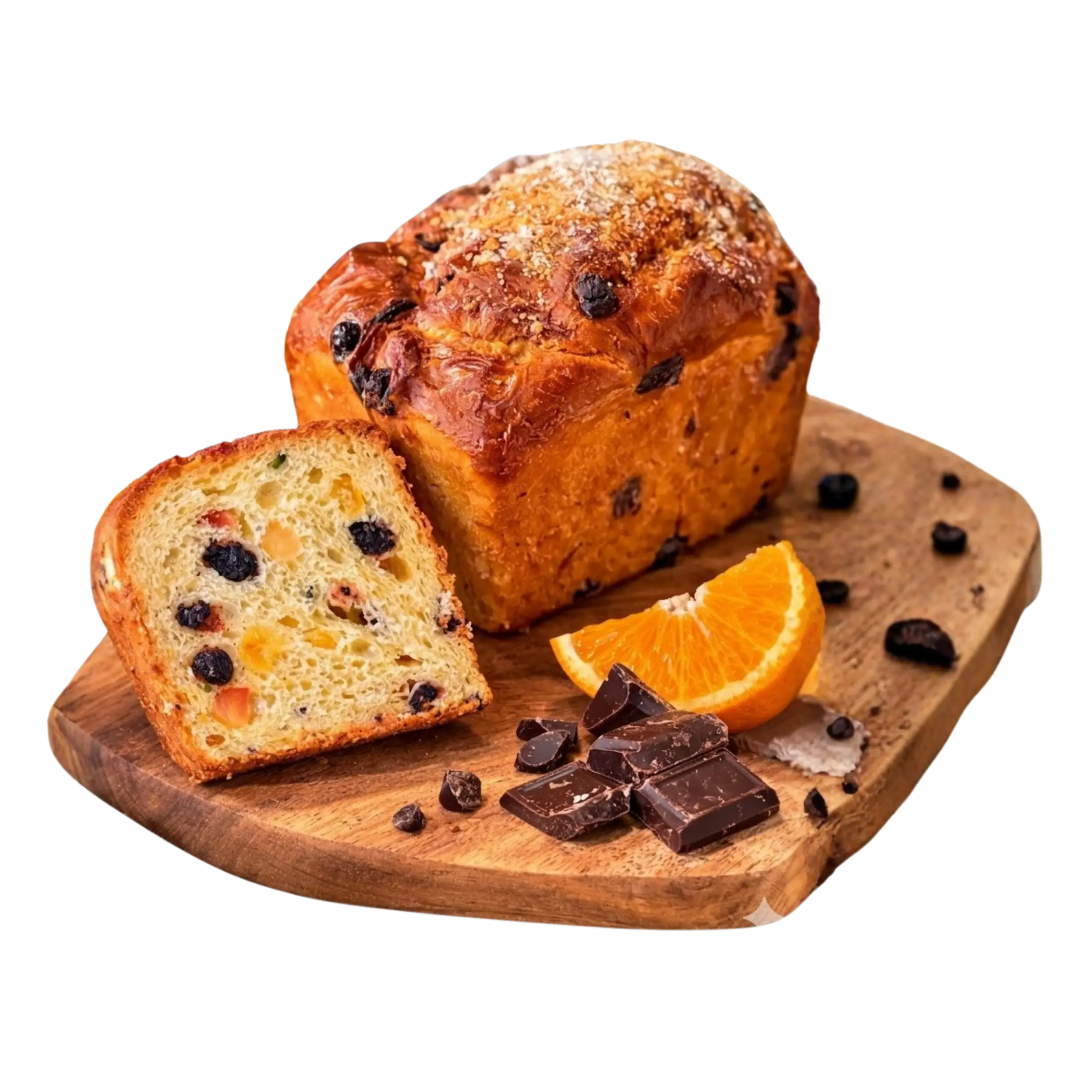 Пшенично брашно тип 500 (глутен), вода, яйца 5%, краве масло 4% (лактоза), слънчогледово масло, инстантна мая, натурален шоколад 5.5% (какаова маса, захар, какаово масло, емулгатор – слънчогледов лецитин, полиглицерол полирицинолеат), микс от плодове 7% (портокал, смокиня, череша, дюля, захар, вода, глюкоза, регулатор на киселинността: лимонена киселина), захар, сух яйчен меланж, сухо обезмаслено мляко, ароматизант – портокал, сол, антиоксидант (аскорбинова киселина), ензими.
