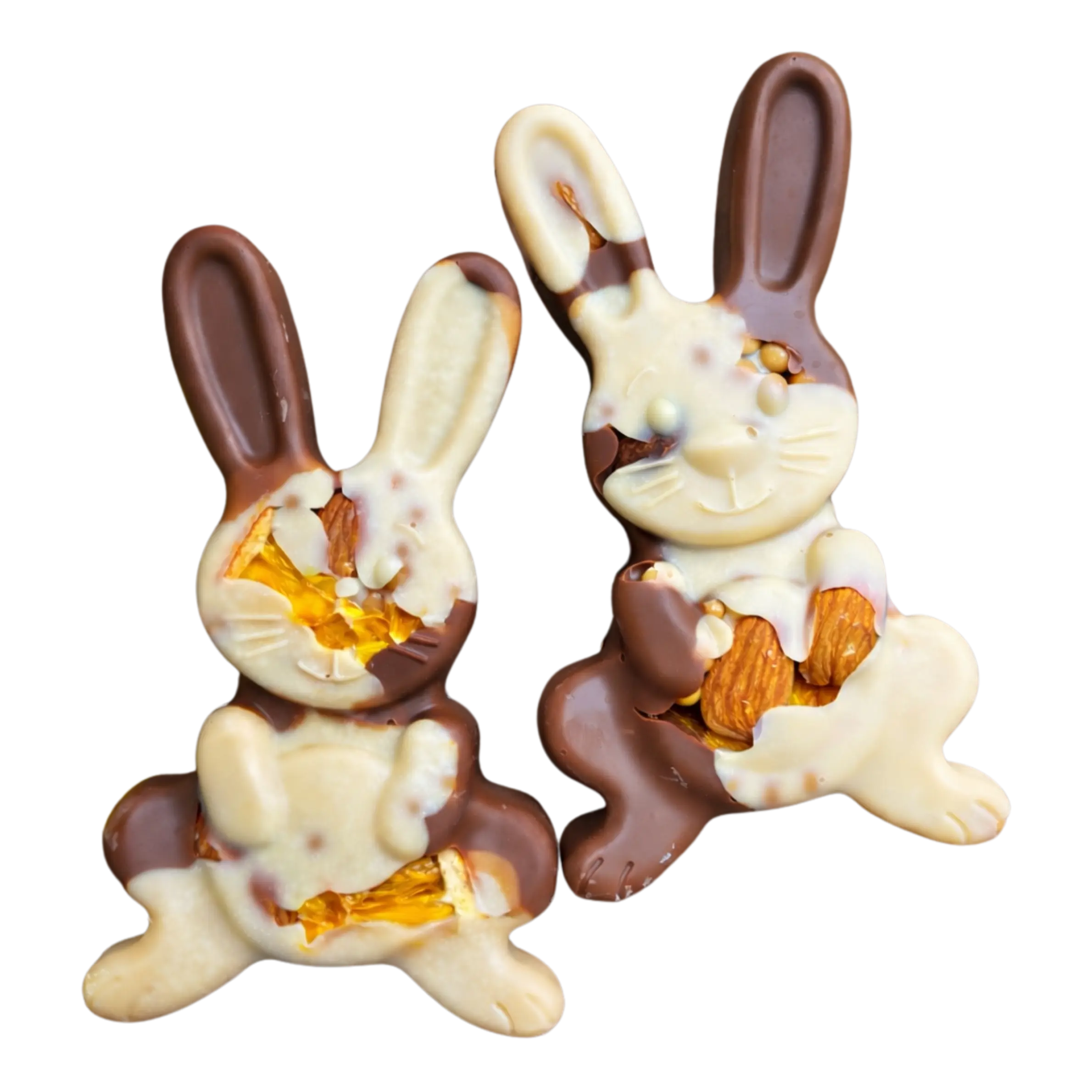 Бял белгийски шоколад Callebaut, млечен белгийски шоколад Callebaut, портокал, бадеми, хрупкав солен карамел Callebaut Crispearls.