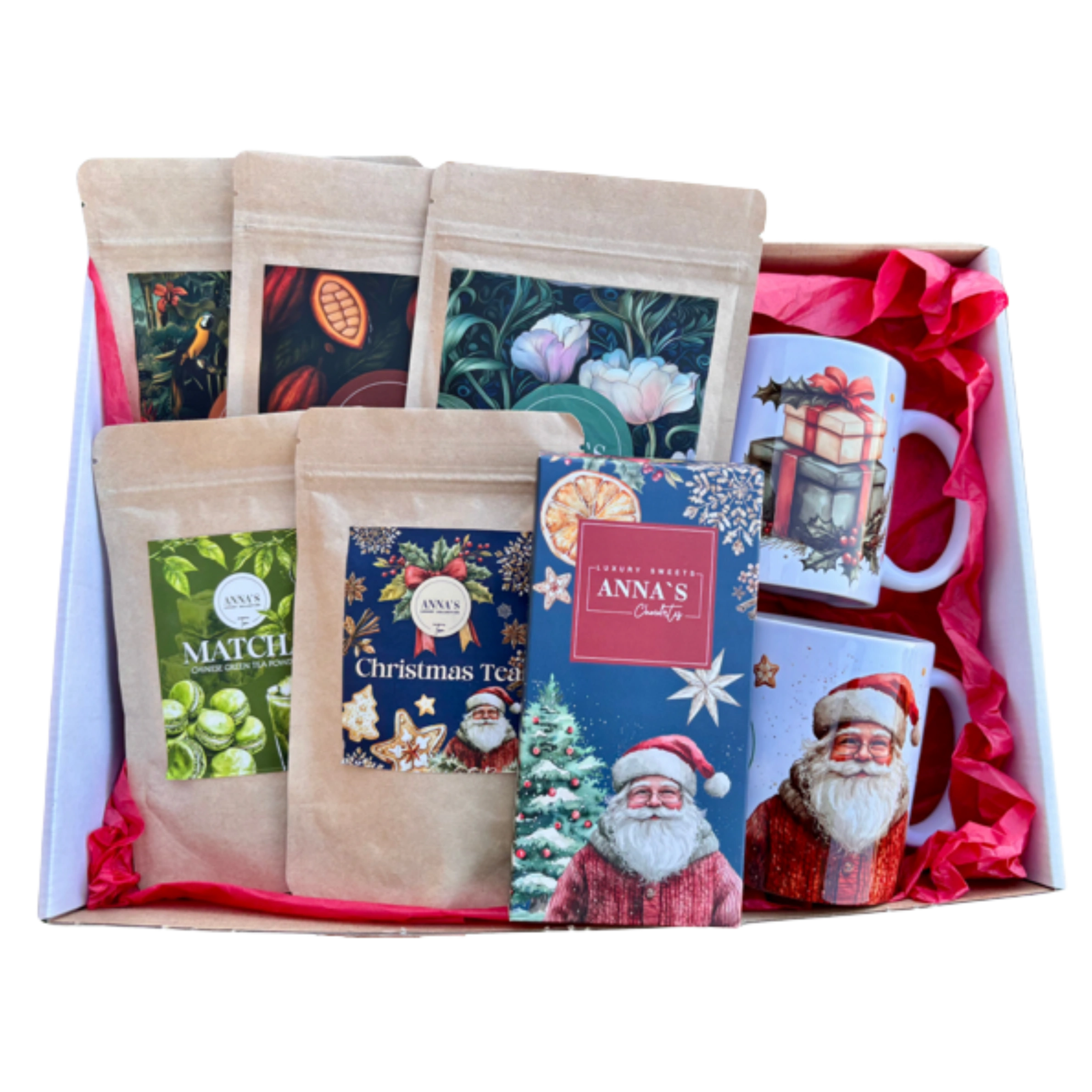 Съдържа Чай Ройбос манго и папая, Цейлонски черен чай с мента и шоколад, Детокс, Коледен чай,Матча, две чаши, Шоколад “Коледна звезда” в празнична кутия